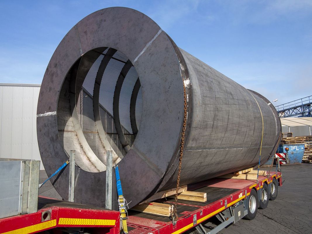 Im Bereich Recycling und Separation bieten wir Trommeln für fast jeden Zweck und in allen Größen an. Auf den folgenden Fotos sehen Sie eine Trommel in Übergröße mit einem Durchmesser von 3m und einer Länge von 8m. Diese Trommel ist für den besseren Materialtransport mit einer Förderschnecke ausgestattet. Der Trommelkörper besteht aus Lochblechen mit einer 10mm Quadratlochung. Zum Kunden wurde diese Trommel in einem Tieflader mit Überbreite geliefert.